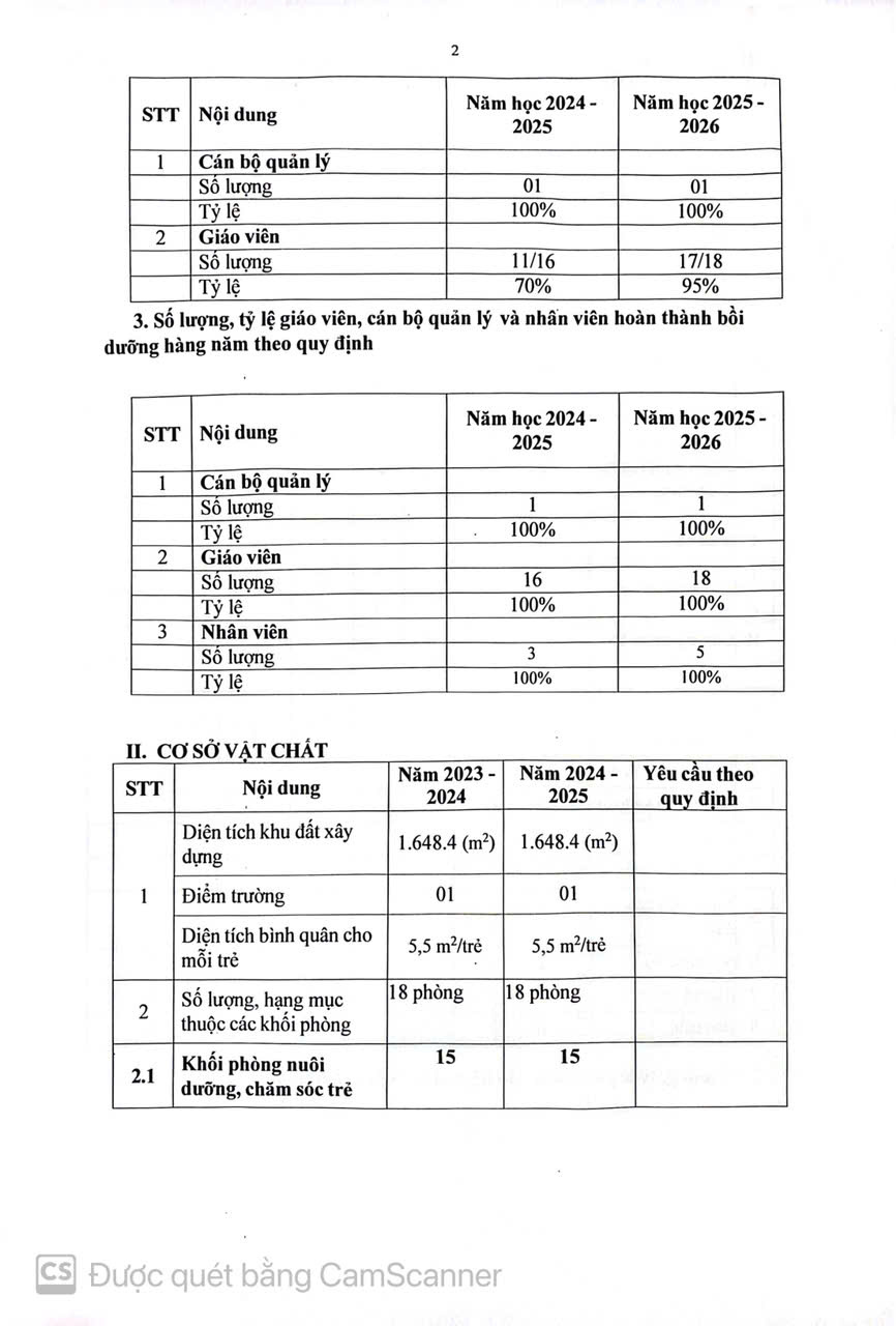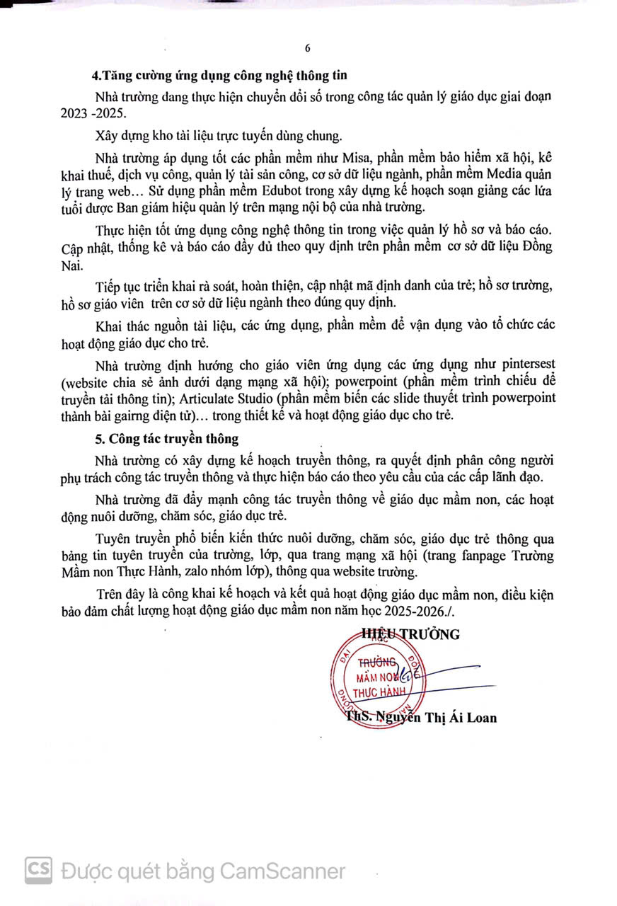 Thông tin về điều kiện đảm bảo chất lượng hoạt động giáo dục mầm non năm học 2025-2026 13.11.2025 03:37 | 10 Share with friends Bài liên quan Thông tin chung về cơ sở giáo dục năm học 2025-2026 (13.11.2025 03:35) Thông tin thu chi tài chính trong cơ sở giáo dục năm học 2025-2026 (13.11.2025 03:33) Kế hoạch thực hiện nhiệm vụ năm học 2025-2026 (13.11.2025 03:28) Kế hoạch thực hiện nhiệm vụ năm học 2024-2025 (10.12.2024 09:27) Công bố Quyết định bổ nhiệm Hiệu trưởng Trường Mầm non Thực Hành (04.09.2024 01:57) Công bố quyết định bổ nhiệm Phó hiệu trưởng (Phụ trách chung) trường mầm non Thực Hành (15.09.2022 09:28) Chiến lược phát triển DNU (Dự thảo) (28.06.2021 04:42) 1