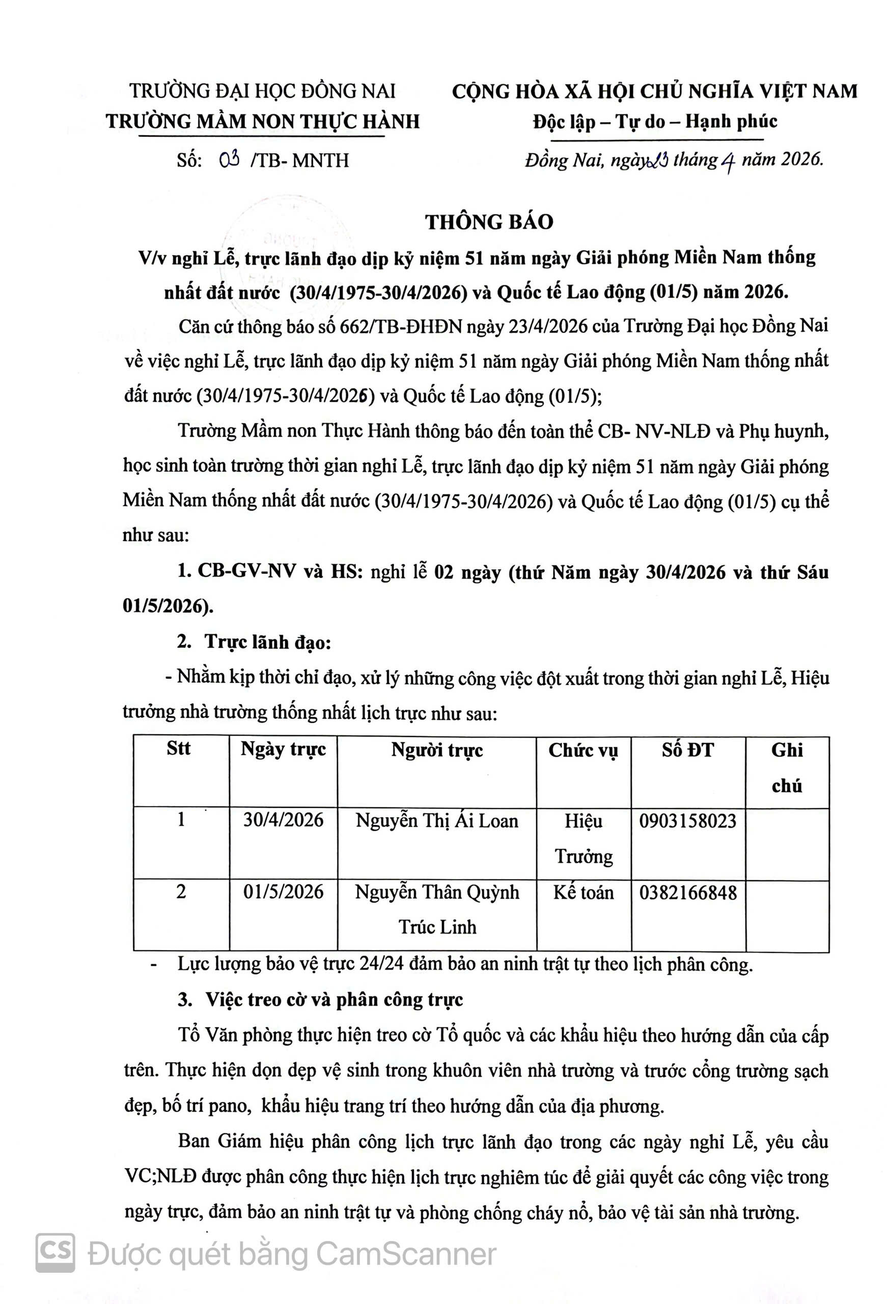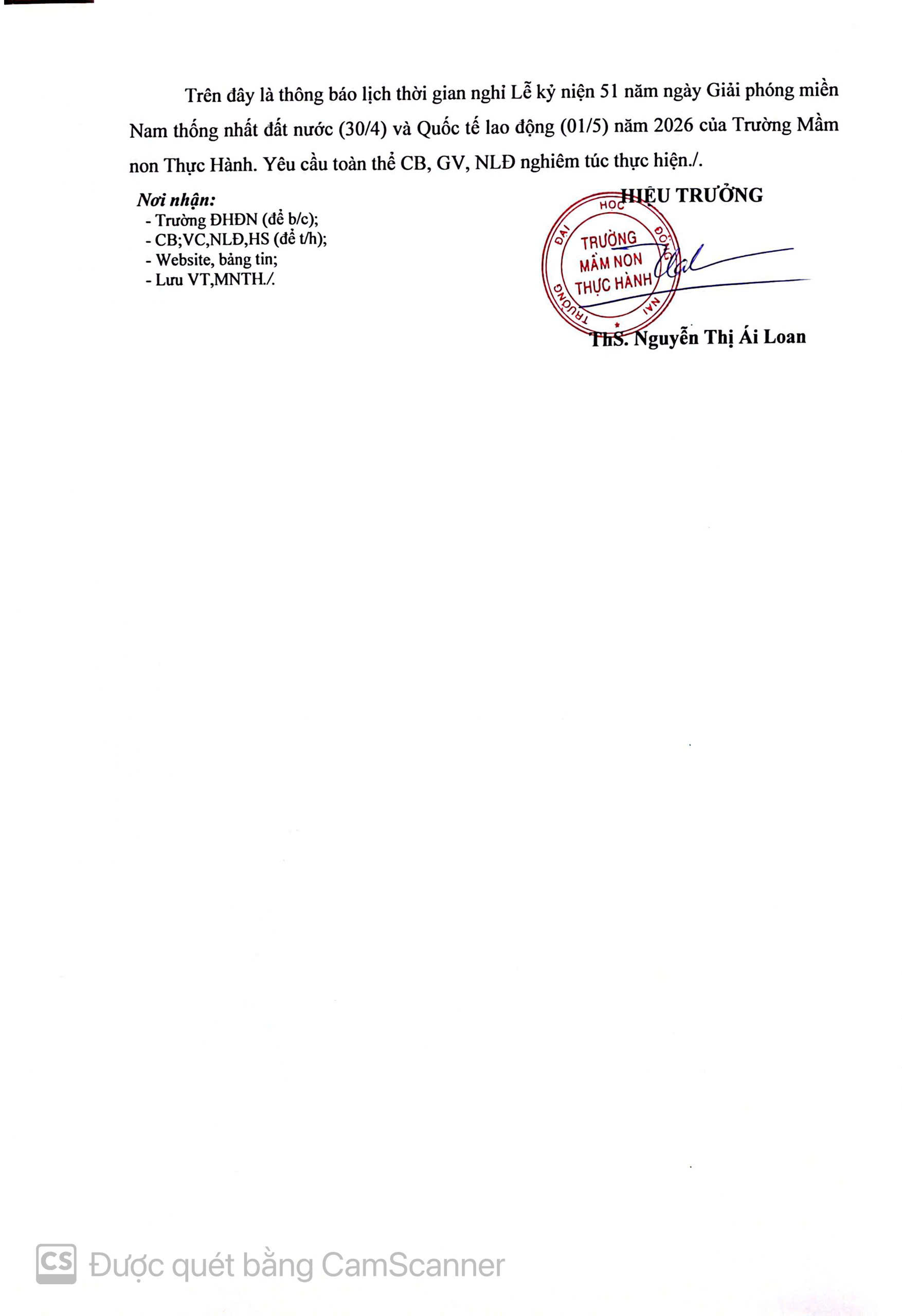 Về việc nghỉ Lễ, trực lãnh đạo dịp 30/4 và 01/5 năm 2026 23.04.2026 02:35 | 801 Share with friends Bài liên quan Về việc nghỉ Lễ, trực lãnh đạo dịp Giỗ tổ Hùng Vương (10/3 Âm lịch) năm 2026 (22.04.2026 09:21) Thời gian nghỉ và lịch trực lãnh đạo dịp Tết âm lịch Bính Ngọ năm 2026 của CB-GV-NV-HS (21.01.2026 08:47) Nghỉ Lễ, trực lãnh đạo dịp Giổ tổ Hùng Vương 10/3 Âm lịch năm 2025 (10.04.2025 10:06) THÔNG BÁO LỊCH NGHỈ TẾT NGUYÊN ĐÁN ẤT TỴ 2025 (08.01.2025 02:53) THÔNG BÁO NGHỈ TẾT DƯƠNG LỊCH 2025 (23.12.2024 03:17) Quy chế hoạt động nhà trường năm học 2024-2025 (10.12.2024 09:10) Công khai về thu chi tài chính (01.11.2024 03:11) Công khai điều kiện bảo đảm chất lượng hoạt động Giáo dục Mầm non (01.11.2024 03:00) Công khai thông tin chung về cơ sở giáo dục Mầm non (08.10.2024 03:25) Thông báo nghỉ Lễ Quốc khánh 2/9 (22.08.2024 09:27) THÔNG BÁO NGHĨ LỄ 30/4 1/5 2024 (24.04.2024 11:54) THÔNG BÁO NGHỈ TẾT DƯƠNG LỊCH 2024 (20.12.2023 08:24) THÔNG BÁO NGHỈ LỄ QUỐC KHÁNH 2/9/2023 (25.08.2023 02:39) ƯU TIÊN LỚP LÁ LÊN LỚP 1 (09.05.2023 10:50) THÔNG BÁO LIÊN THÔNG MẦM NON - TIỂU HỌC (11.02.2023 09:03) Thực đơn cho bé tuần 1 tháng 10 năm 2022 (01.10.2022 01:42) Thông báo tuyển sinh năm học 2022-2023 (17.09.2022 02:02) Thông báo Fanpage chính thức của trường Mầm Non Thực Hành Sư Phạm (17.09.2022 01:32) THÔNG BÁO CHIÊU SINH NĂM HỌC 2022-2023 (02.07.2022 11:14) THÔNG BÁO CHIÊU SINH NH 2021-2022 (14.02.2022 12:25) 1