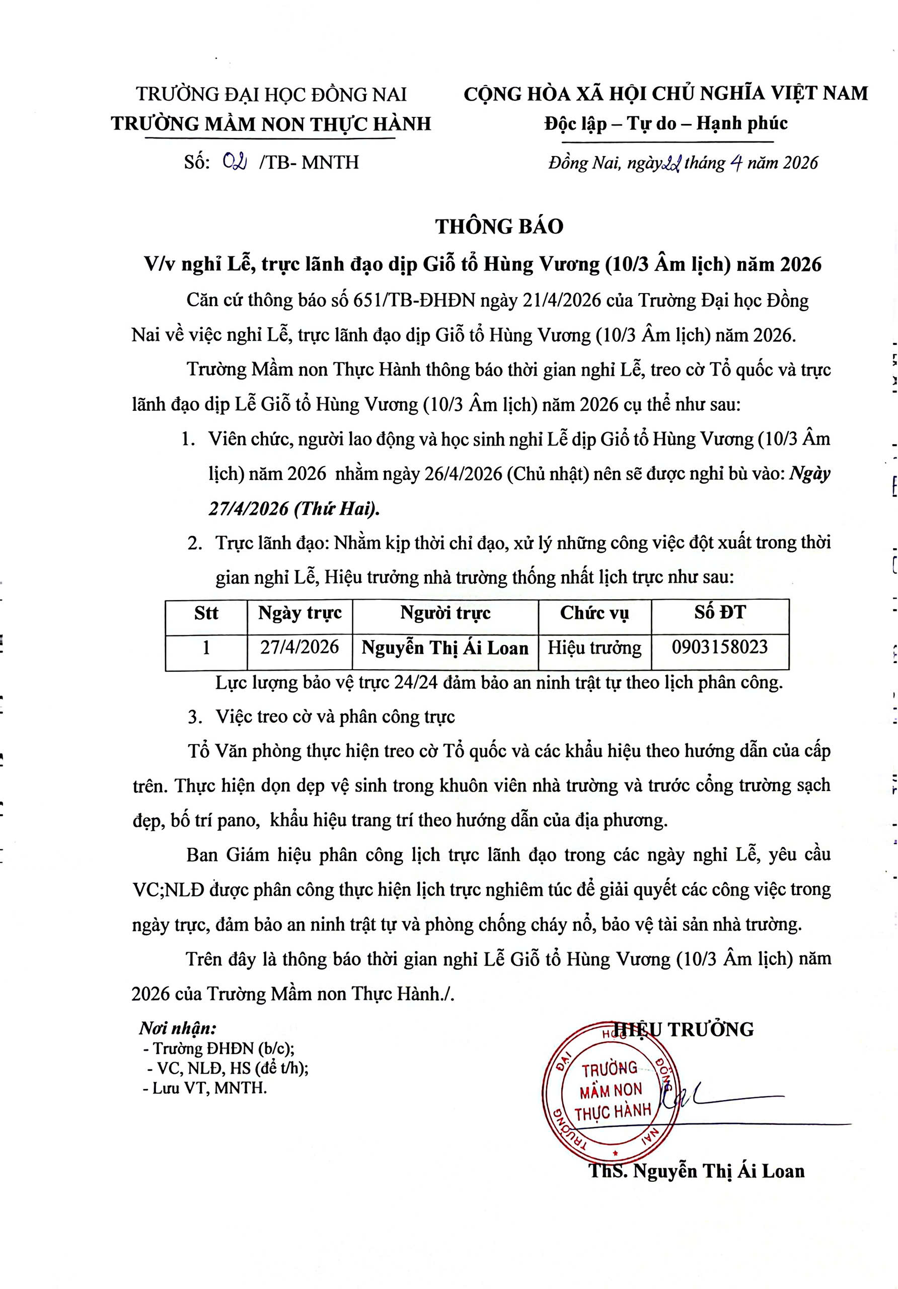 Về việc nghỉ Lễ, trực lãnh đạo dịp Giỗ tổ Hùng Vương (10/3 Âm lịch) năm 2026 22.04.2026 09:21 | 18 Share with friends Bài liên quan Về việc nghỉ Lễ, trực lãnh đạo dịp 30/4 và 01/5 năm 2026 (23.04.2026 02:35) Thời gian nghỉ và lịch trực lãnh đạo dịp Tết âm lịch Bính Ngọ năm 2026 của CB-GV-NV-HS (21.01.2026 08:47) Nghỉ Lễ, trực lãnh đạo dịp Giổ tổ Hùng Vương 10/3 Âm lịch năm 2025 (10.04.2025 10:06) THÔNG BÁO LỊCH NGHỈ TẾT NGUYÊN ĐÁN ẤT TỴ 2025 (08.01.2025 02:53) THÔNG BÁO NGHỈ TẾT DƯƠNG LỊCH 2025 (23.12.2024 03:17) Quy chế hoạt động nhà trường năm học 2024-2025 (10.12.2024 09:10) Công khai về thu chi tài chính (01.11.2024 03:11) Công khai điều kiện bảo đảm chất lượng hoạt động Giáo dục Mầm non (01.11.2024 03:00) Công khai thông tin chung về cơ sở giáo dục Mầm non (08.10.2024 03:25) Thông báo nghỉ Lễ Quốc khánh 2/9 (22.08.2024 09:27) THÔNG BÁO NGHĨ LỄ 30/4 1/5 2024 (24.04.2024 11:54) THÔNG BÁO NGHỈ TẾT DƯƠNG LỊCH 2024 (20.12.2023 08:24) THÔNG BÁO NGHỈ LỄ QUỐC KHÁNH 2/9/2023 (25.08.2023 02:39) ƯU TIÊN LỚP LÁ LÊN LỚP 1 (09.05.2023 10:50) THÔNG BÁO LIÊN THÔNG MẦM NON - TIỂU HỌC (11.02.2023 09:03) Thực đơn cho bé tuần 1 tháng 10 năm 2022 (01.10.2022 01:42) Thông báo tuyển sinh năm học 2022-2023 (17.09.2022 02:02) Thông báo Fanpage chính thức của trường Mầm Non Thực Hành Sư Phạm (17.09.2022 01:32) THÔNG BÁO CHIÊU SINH NĂM HỌC 2022-2023 (02.07.2022 11:14) THÔNG BÁO CHIÊU SINH NH 2021-2022 (14.02.2022 12:25) 1